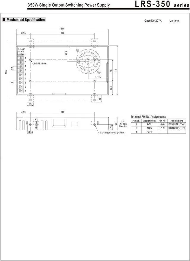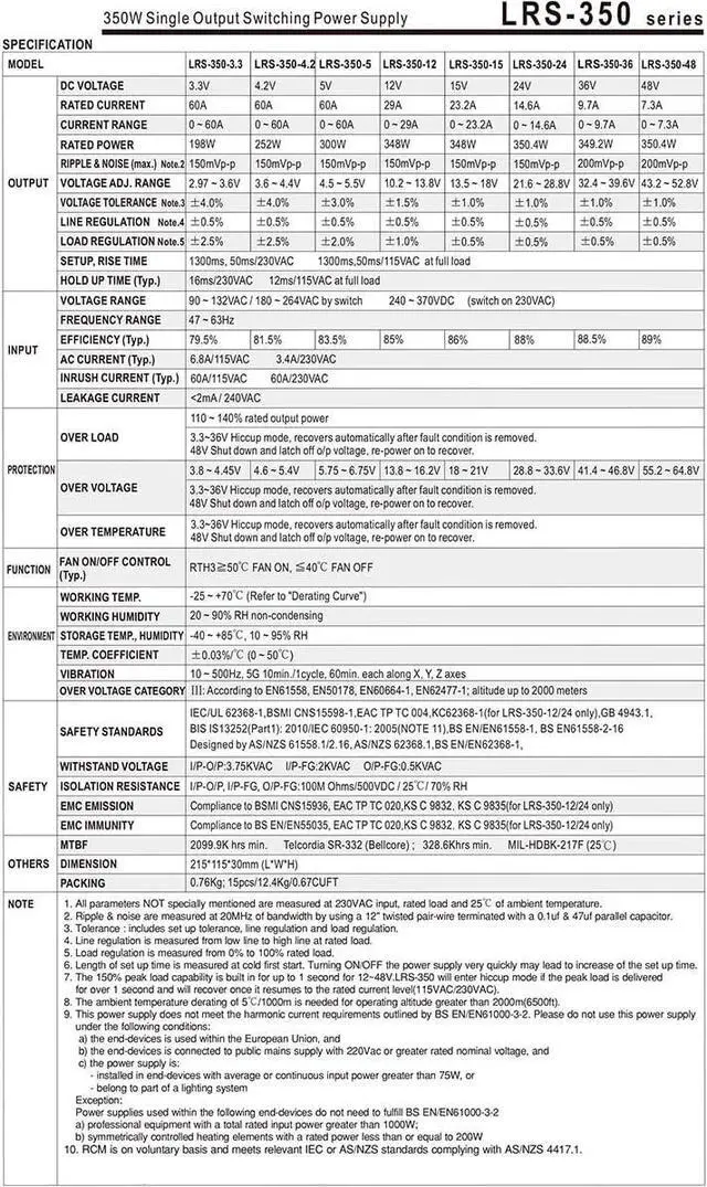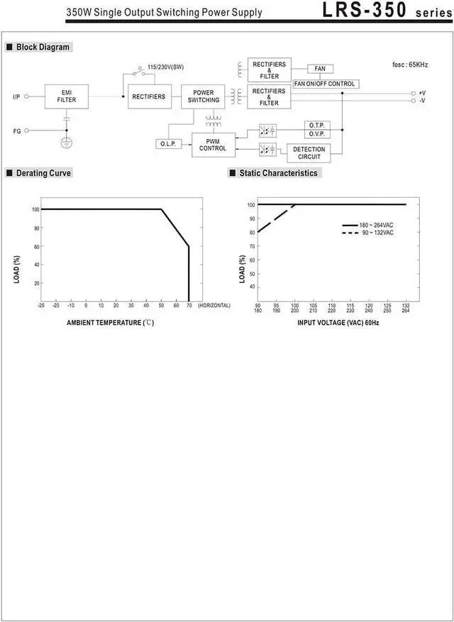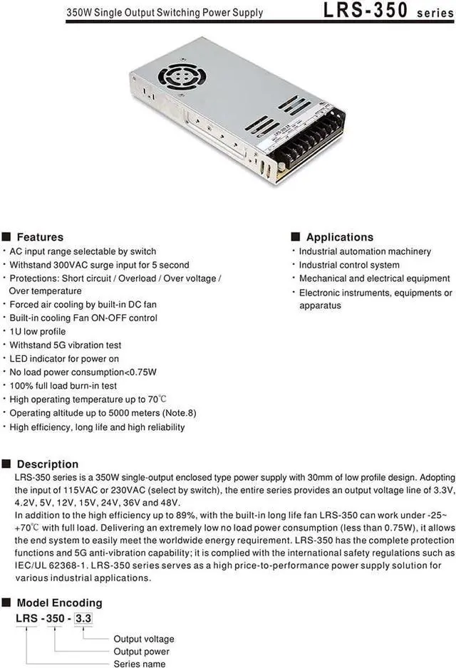 LRS-350 series is a 350W single-output enclosed type power supply with 30mm of low profile design. Adoptingthe input of 115VAC or 230VAC (select by switch), the entire series provides an output voltage line of 3.3v,4.2V,5V,12V,15V,24V,36V and 48V.