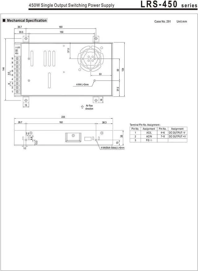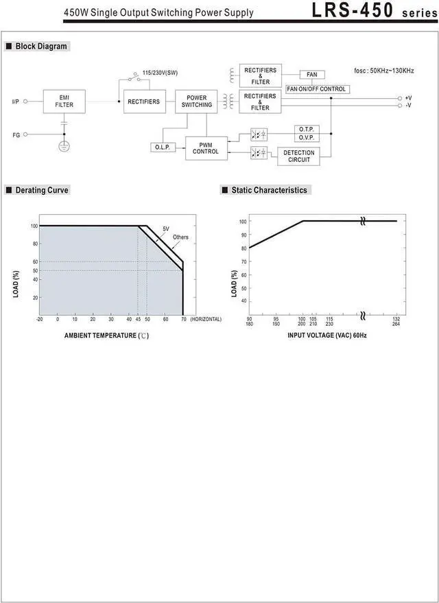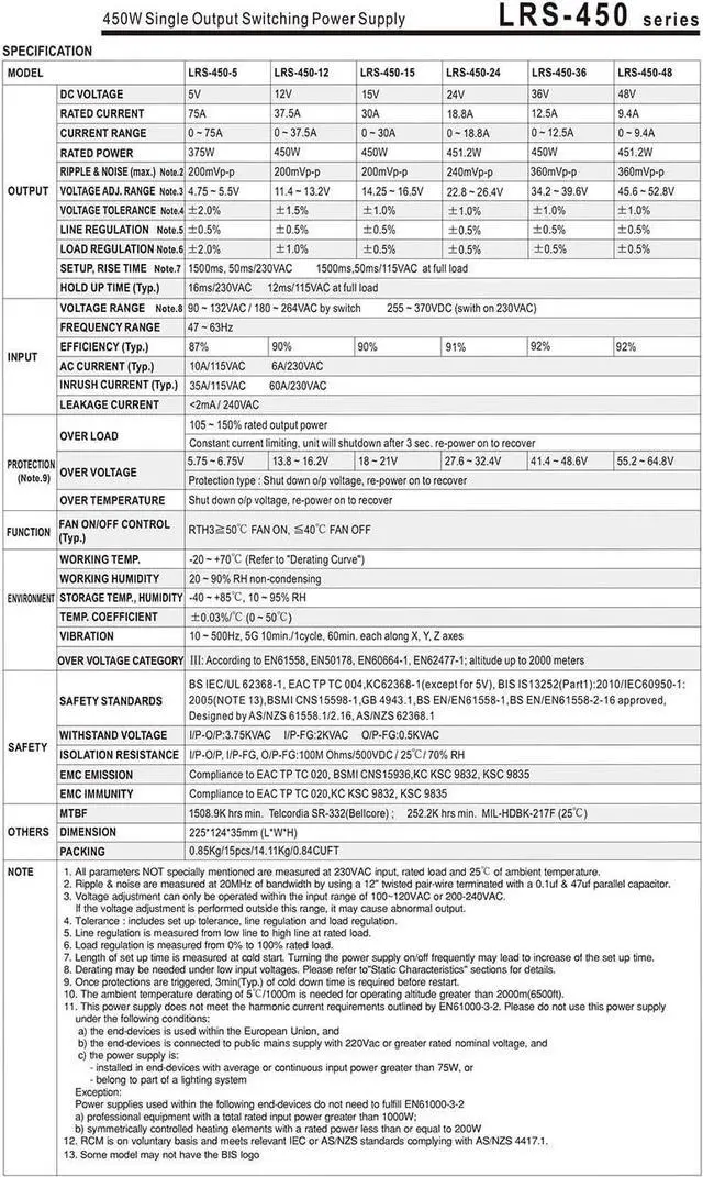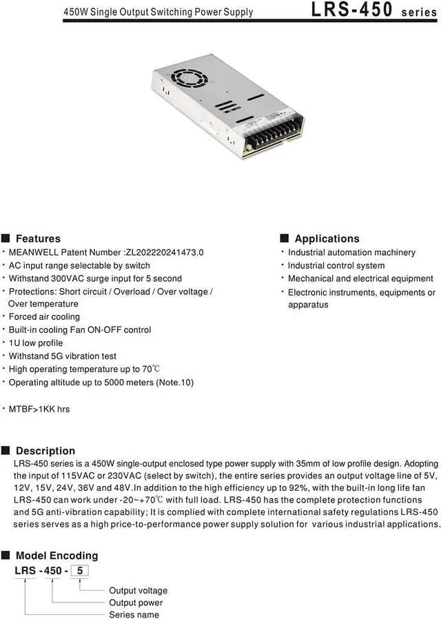 LRS-450 series is a 450W single-output enclosed type power supply with 35mm of low profile design. Adoptingthe input of 115VAC or 230VAC (select by switch), the entire series provides an output voltage line of 5V,12V,15V,24V,36V and 48V.In addition to the high efficiency up to 92%, with the built-in long life fanLRS-450 can work under -20~+7O with full load.LRS-450 has the complete protection functionsand 5G anti-vibration capability; lt is complied with complete international safety regulations LRS-450 series serves as a high price-to-performance power supply solution for various industrial applications.