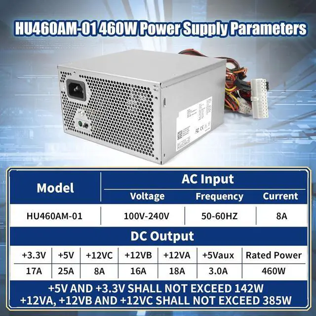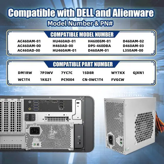 [Compatible models] HU460AM-01 460W power supply can replace Dell power supply: AC460AM-01, AC460AM-00, AC460AD-00, HU460AD-01, H460AD-00, HU460AM-01, H460EGM-01, DPS-460DBA, D460AM-01, D460AM-02, D460AM-03, L350AM-00, DM1RW, WC1T4, 7P3WV, 1KG21, 7YC7C, PC9004, 15D8R, CN-0WC1T4, WY7XX, FVGCW, GJXN1