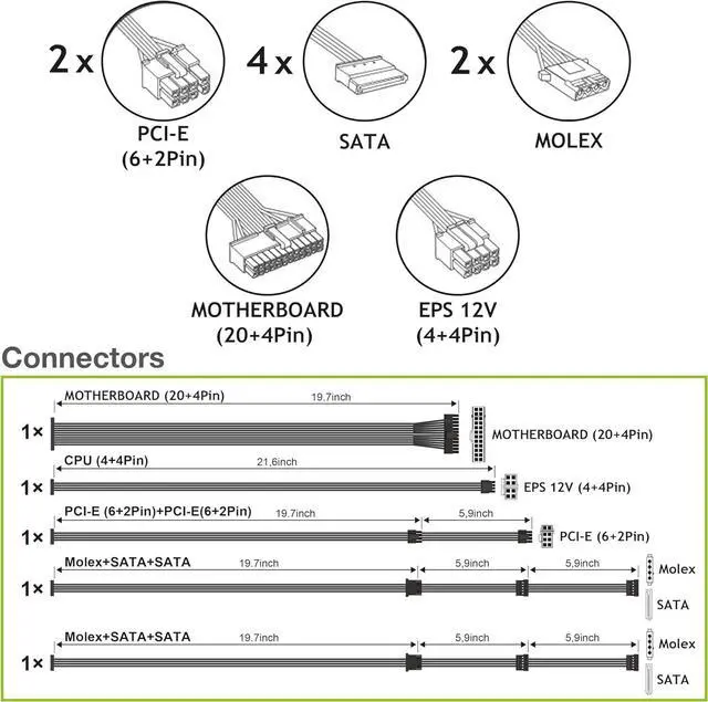 COMPLETE CONNECTORS FOR EVERY NEED: Equipped with 1 20+4 pin connector, 1 12V 4+4 pin connector, 2 PCI-E (6+2) connectors, 4 SATA connectors and 2 Molex, to support a wide range of hardware components.