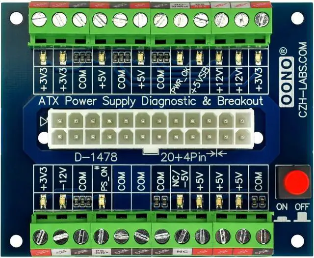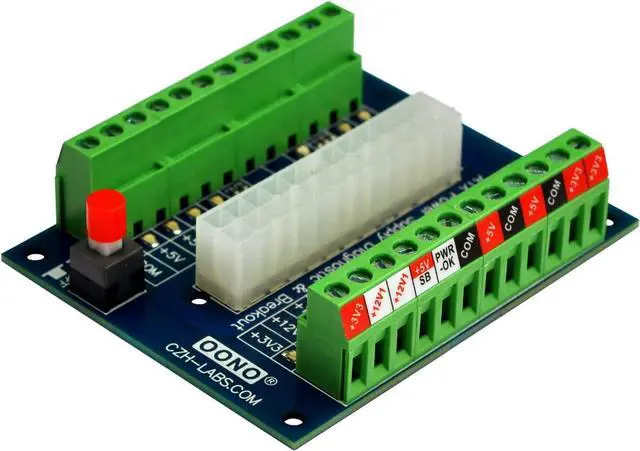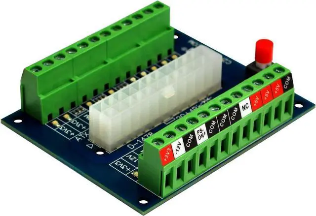 24-pins Standard ATX Connector, support 20 / 20+4 / 24 pins wire header. With latching button switch to control ATX power supply output ON/OFF.