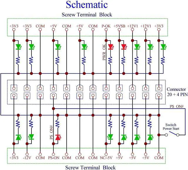 Special Note: The PS_ON LED lights up when the output is OFF and goes out when the output is ON, this is just the opposite of the indication status of other LEDs. Since many new ATX power supplies no longer provide output -5V, the NC/-V LED will not light up when connected to this type ATX power supply.