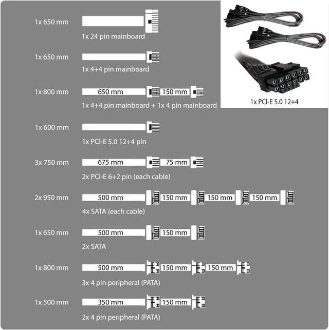 Connectors:The Gaming power supply with 20+4-Pin Mainboard,4+4-Pin Mainboard 12V(8pin EPS)4 Pin Mainboard 12V,PCI-Express 6+2-Pin,PCI-Express 5.0 12+4-Pin, STAT,PATA. the power supply allows for easy customization and hassle-free cable management
