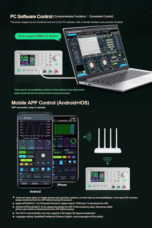 RD6006PW supports USB connection to PC software, it can also be connect to phone app, for the connection way, please check the instruction