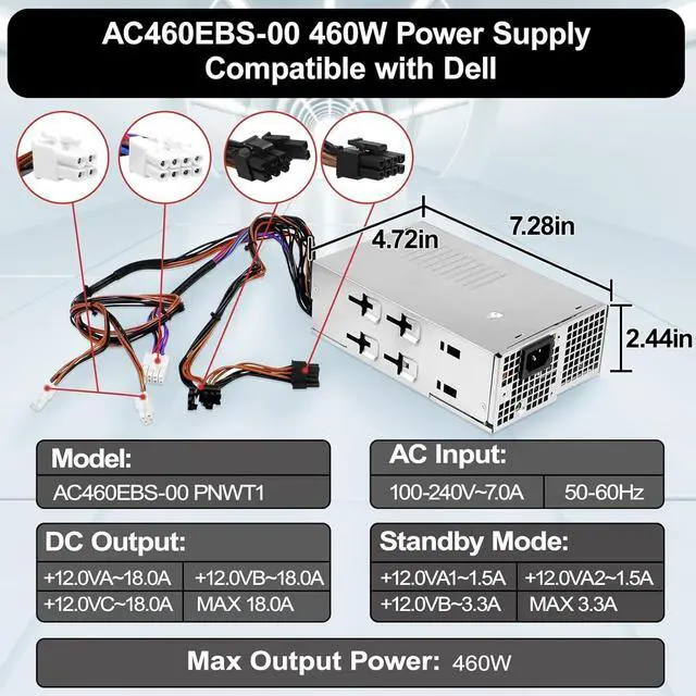 Input & OutputInspiron 3020 Power Supply AC Input(50-60Hz): 100-240V~, 7.0A. Connector: 8pin+6+2/8*2+4pin*2, DC Output: +12.0VA1-/18.0A & +12.0VA2-/18.0A,MAX18.0A. Stanby mode: +12.0VA1-/1.5A & +12.0VA2-/1.5A,MAX 1.5A, MAX 3.3A. Max Output Power is 460W