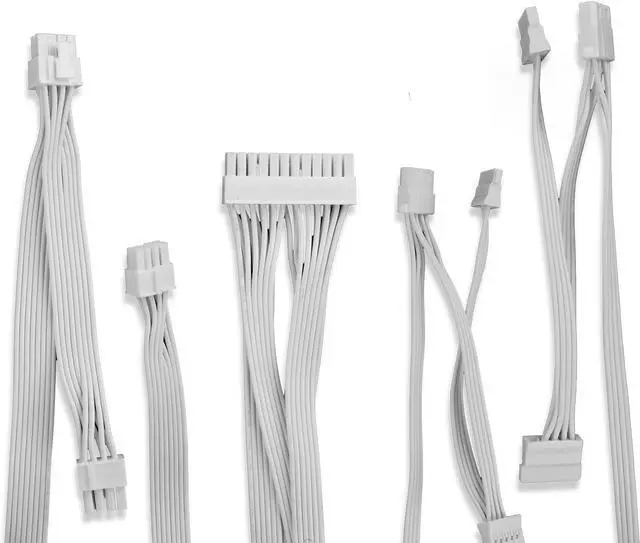 Extra Long Flat Cables Includes 1x ATX MB 20+4-pin, 1x EPS +12V 4+4-pin, 2x PCI-E 6+2-pin, 4x SATA, 2x Molex 4-pin, which facilitate assembly and improve airflow inside the enclosure.