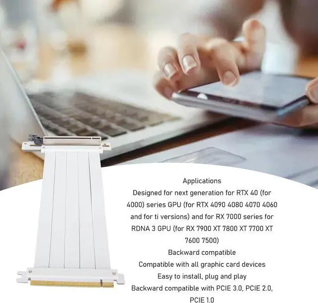 **APPLICATIONS**: The PCIE 4.0 Riser Cable is specifically designed for the newest RTX 40 series GPUs, including the RTX 4090, 4080, 4070, 4060, and their Ti versions, as well as the RX 7000 series RDNA 3 GPUs, ensuring backward compatibility with earlier models.
