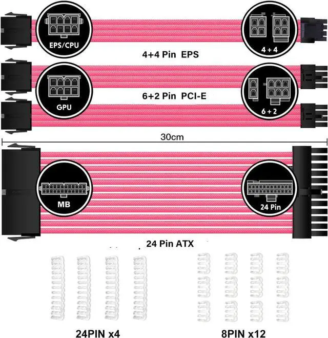 Includes: (1pcs) 24-pin ATX, (1pcs) 4+4-pin EPS, (2pcs) 6+2-pin PCI-E. 3pcs Cable combs for each cable