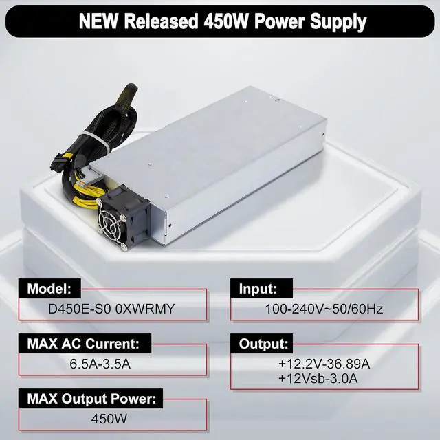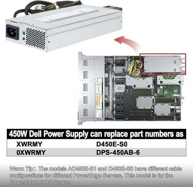 CompatibilityD450E-S0 0XWRMY Power Supply Compatible with Dell PowerEdge R440. 450W Dell Power Supply can replace part numbers as XWRMY, D450E-S0, 0XWRMY, DPS-450AB-6