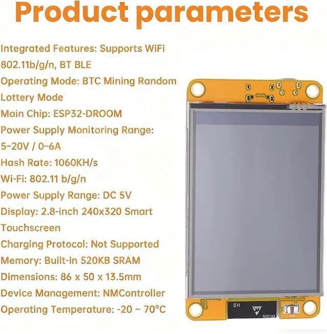 Powerful Core Performance: At its core is a support for ESP32 development board, handling all computation and networking. The miner features a 1060KH/s hash rate and comes with built in 520KB StaticRAM memory, ensuring efficient mining.