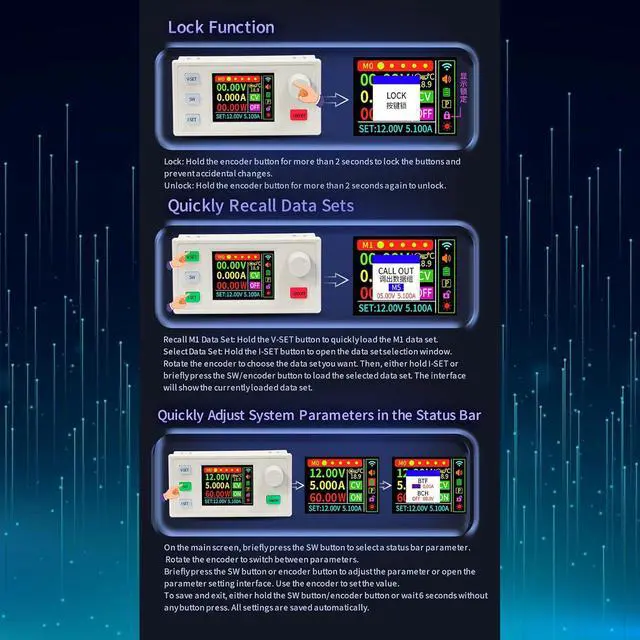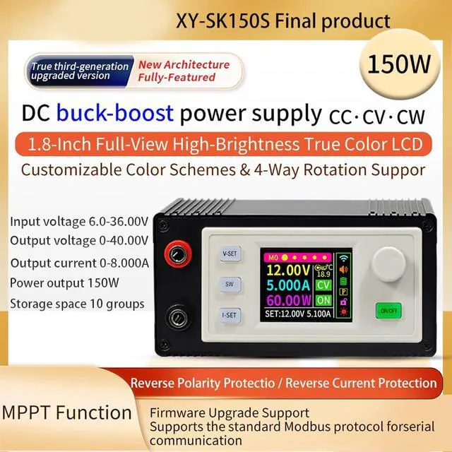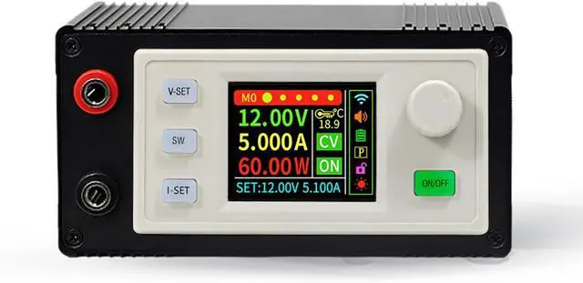 Features 6 36V input ranges, 0 36V adjustable output, 88% efficiency, 10 memory presets, and multiple protections for safe, stable power regulation