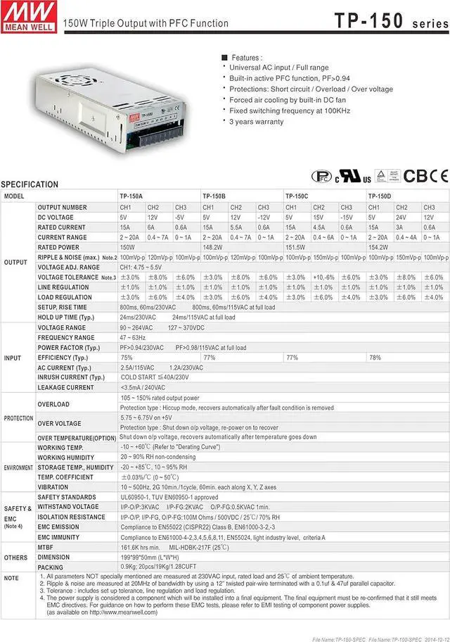 Universal AC input / Full range Over temperature protection(200~320W built-in, option for 100W and 150W) Built-in active PFC function Forced air cooling by built-in DC fan(150W / 200W / 320W) 3 years warranty