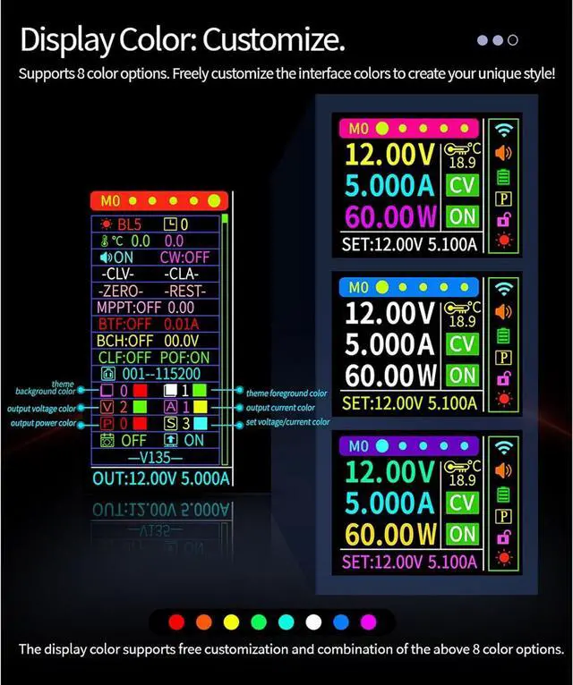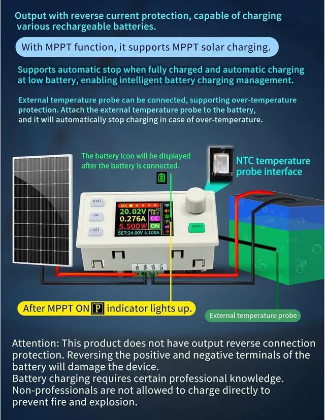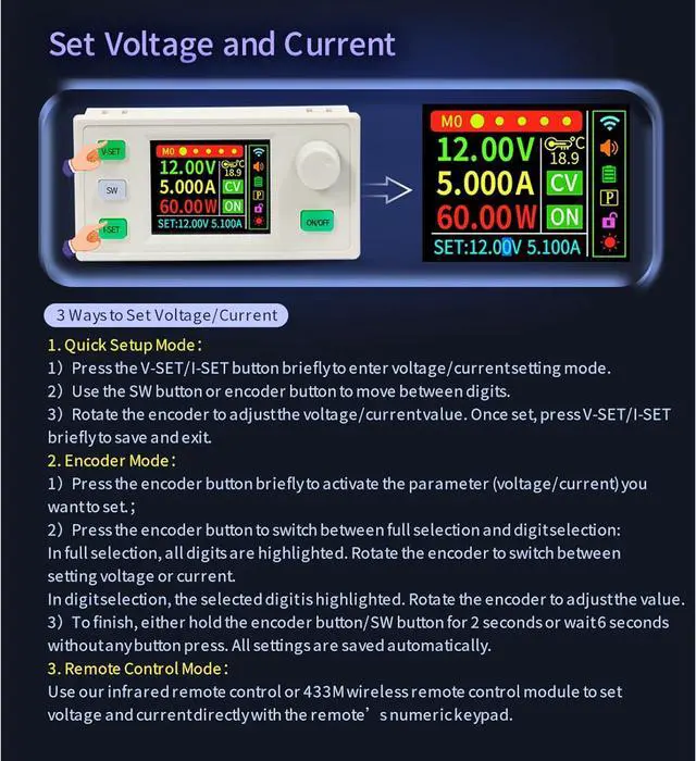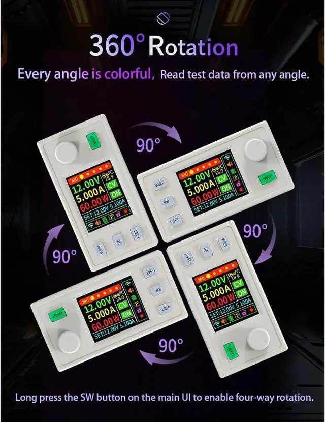 Features 6 36V input ranges, 0 36V adjustable output, 88% efficiency, 10 memory presets, and multiple protections for safe, stable power regulation