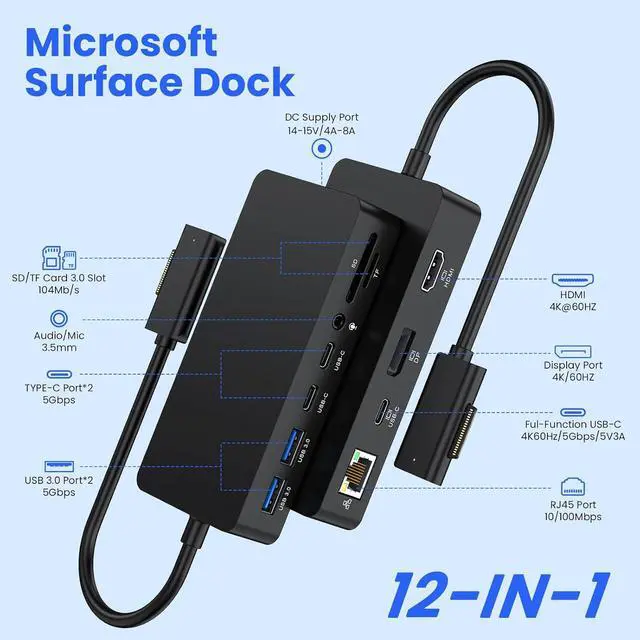 12-in-1 Surface Dock All-in-One Expansion: Specially designed for Surface devices, expanding 12 essential ports via Surface Connect: HDMI (4K@60Hz), DisplayPort (4K@60Hz), full-function USB-C (4K@60Hz video + data + 5V/3A charging), 2× USB-C 3.0 data, 2× USB 3.0, SD & TF card slots (dual-card simultaneous reading, up to 2TB), RJ45 Ethernet (100Mbps), and 3.5mm audio. Perfect for multi-display setups, fast data transfer, and stable peripheral connections.
