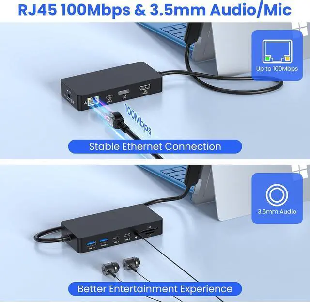 High-Speed Data Transfer & Dual-Card Reader: Two USB 3.0 and two USB-C 3.0 ports deliver up to 5Gbps transfer speeds. SD/TF 3.0 slots support UHS-I and up to 2TB ca