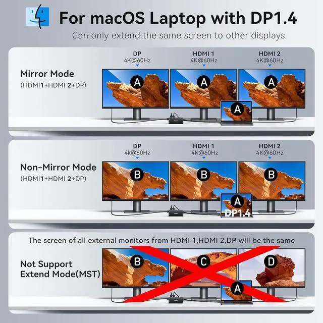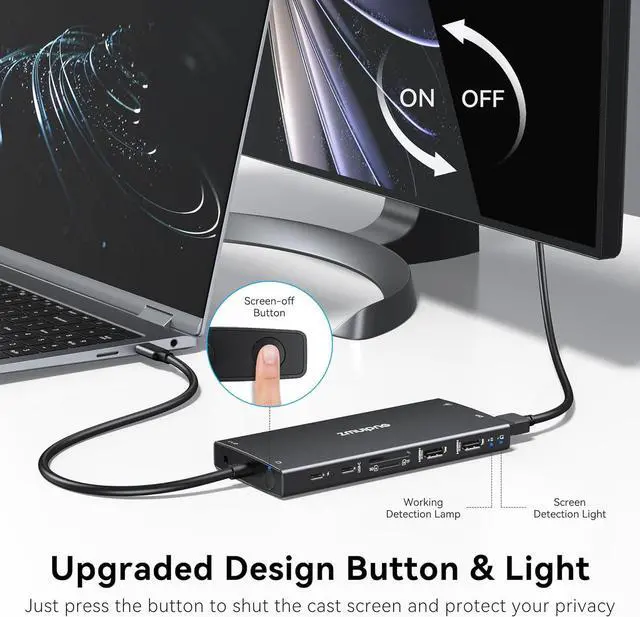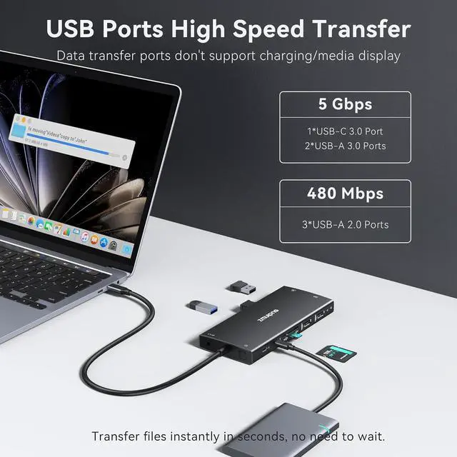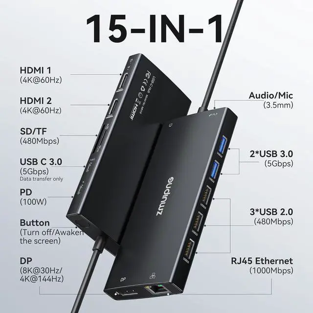 1Multiple Displays for Win2Dual Displays for Win3Multiple Displays for Mac4 About Resolution Support1Gigabit Ethernet2100w Fast Charging Port3Fast Data Transfer4SD/TF Card Reader5Wireless Mouse Connection **NOTE**Please ensure that your device has a thunderbolt 3/4 / USB-C 3.1 Gen 2 or USB-C 3.2 Gen 2 that support "Power Delivery&DisplayPort Alt Mode" to support video output. HDMI function needs to confirm if the usb c port of your device supports DisplayPort Alternate Mode. Some laptops with built-in HDMI ports may not be compatible. If not sure please check with us. HODO Dokcing Station are happy check if this dock is compatible for your device.Dell Laptops:Support Latitude 3540 Laptop Model/Latitude 3440 / 3340 or 2-in-1/ 3450 / 3550 / 3110/ 3140/ 3420/ 3445/ 3510/ 3500/ 3520/ 3540/ 3571/ 5550 Model5550/ 5540 Model5540/ 5440 Model5440/ 5340 or 2-in-1/ 5450 / 5350 or 2-in-1/ 5320/ 5530/ 5310/ 5411/ 5420/ 5421/ 5430/ 5400/ 5510/ 5520/ 5580/ 7440 / 7340 or 2-in-1/ 7640 / 7450 or 2-in-1 7450/ 7320 Detachable/ 7350 or 2-in-1/ 7650 / 7480/ 7230/Latitute 7280/ 7300/ 7330/ 7400/ 7410/ 7420/ 7430/ 7440/ 7480/ 7490/ 7530/ 9440 2-in-1, etc.Dell Laptops:Support Alienwarex14/x15/x16/x17 R2 Gaming Laptop/Alienware x15 R7 Gaming LaptopAlienware m16/m18 Gaming Laptop/G16 Gaming Laptop Model7630/G15 Gaming Laptop Model5530/5535/Precision 5690 Workstation Model5690/Precision 3581 Workstation Model3581/Precision 5680 WorkstationModel5680/Precision 7780 WorkstationModel7780/Precision 7680 WorkstationModel7680/Precision 5480 WorkstationModel5480/Precision 3480 WorkstationModel3480/Precision 3580 WorkstationModel3580, etcHP Laptops:Support Spectre Laptop 13-af001TU/Spectre x360 13t/Spectre folio (13t-ak000cto)/HP Spectre x2/HP Spectre x360/HP Elite×2 1012/HP Elitebook Folio G1/HP ZBook 15 G3/HP Laptop 13-af001TU/HP Laptop 13-af001TU/HP Envy Laptop 16-h1047nr/HP Envy x360 13-bd0080ng/HP Envy 360 convertible 15/HP Envy X360 2-IN-1 Laptop 15-EW0007TX/HP Envy 2-IN-1 X360 15.6 inch Laptop 15-FE0001TU - Silver/HP Envy 2-IN-1 X360 15.6 inch Laptop 15-FE0010TU - Silver/HP Envy 2-IN-1 X360 15.6 inch Laptop 15-FE0000TX - Silver,etc.HP Laptops:Support HP Envy 16 inch Laptop 16-H1003TX - Silver/HP Pavilion x360 Convertible 14-dy2010nr/HP Pavilion 15-eh0009na/HP Pavilion 2-IN-1 X360 14 inch Laptop 14-EK1040TU - Silver/HP Pavilion 2-IN-1 X360 14 inch Laptop 14-EK1025TU - Silver/HP Pavilion 2-IN-1 X360 14 inch Laptop 14-EK1026TU - Pink/HP Pavilion 2-IN-1 X360 14 inch Laptop 14-EK1027TU - Silver/HP Pavilion 15.6 inch Laptop 15-EG3020TU - Gold/HP Pavilion 15.6 inch Laptop 15-EG3001TX -Blue/HP Pavilion 15.6 inch Laptop 15-EG3021TU - Blue,etcHP Laptops:Support HP EliteBook 855 G8/HP EliteBook G7/HP EliteBook 860 G10 16 inch/HP EliteBook 860 G9 16inch/HP EliteBook 1040 G9 14inch/HP EliteBook 1040 G10 14 inch/HP Elite Dragonfly G2/HP Dragonfly G4 13.5 inch/HP Zbook FURY 16 inch G10/HP Zbook Fury 15.6 inch G10/HP Zbook STUDIO 16 inch G10/HP Zbook Firefly 14 inch G10/HP Zbook Firefly 14 g7/HP Zbook Firefly g8 Laptop/HP Zbook FIREFLY 16 inch G10/HP Zbook Power 15.6 inch G10/HP ZBook 17 G4/HP ProBook 450 G10 15.6 inch/HP ProBook 440 G10 14 inch,etc.Lenovo Laptops:Support (Note: ThinkPad series may have Intel and AMD graphics card,and the AMD graphics card may not be compatible with this product.) Support ThinkPad X1 Carbon Gen 7/ThinkPad X1 Carbon Gen 8/ThinkPad X1 Carbon Gen 10 (14 Intel) Laptop/ThinkPad X1 Carbon Gen 11 (14 Intel) Laptop/ThinkPad X1 Extreme Gen 5 (16 Intel) Laptop/ThinkPad X1 Yoga Gen 5/ThinkPad X1 Yoga Gen 7 (14 Intel) 2 in 1 Laptop/ThinkPad X1 Yoga Gen 8 (14 Intel) 2 in 1 Laptop/ThinkPad X1 Carbon Gen 12 (14 Intel) Laptop, etcApple Laptops:**Please Note,it won't