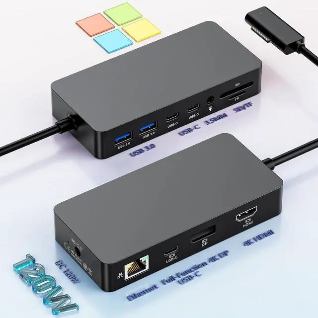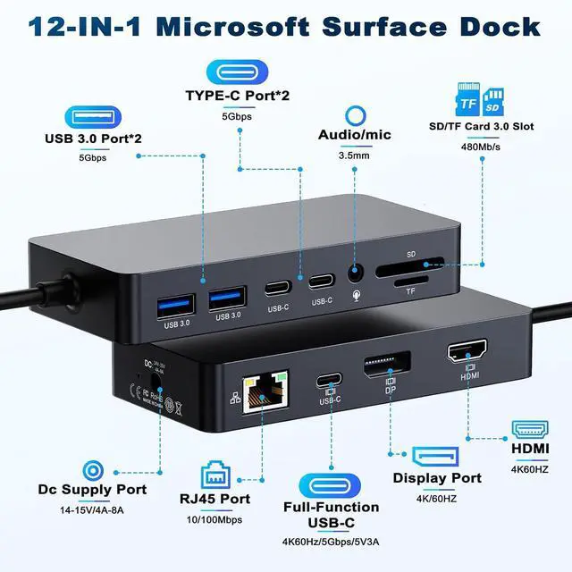 • 12-IN-1 Microsoft Surface Pro Docking Station MS Surface dock Equipped with Surface Connection technology to offers 12 options for Enhanced Productivity. Upgraded Microsoft Surface Docking Station design with HDMI*4K@60Hz, DP*4K@60Hz, Full-function Type-C female socket support: 4K@60HZ video expansion + 5Gbps Data + 5V3A fast charging 3 -in-1; The Surface pro docking station also equip 100Mbps RJ45 Ethernet port, 2x USB C 3.0 data port, 2x USB A 3.0 Data Ports, SD+TF cards slot, 3.5mm audio Port, 120W DC Power Port and 120W surface Power Adapter charger, Surface dock With simple plug and play connectivity.