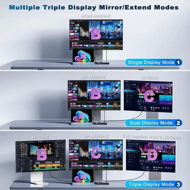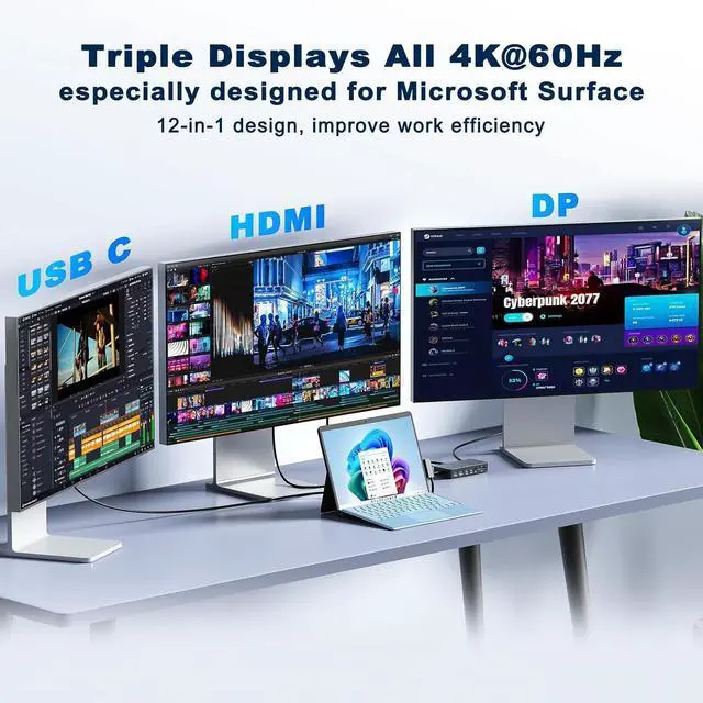 • 4K/60HZ Triple Display Output Microsoft Surface Dock HubMicrosoft Surface Triple Displays Dock(HDMI+DP+Thunderbolt USB-C) with extend or mirror mode, Boost your efficiency 3 times.Enjoy MST (Multiple Stream Transport) functionality for efficient multitasking with up to three screens simultaneously. Whether you need to duplicate or expand your screen. Whether display one screen