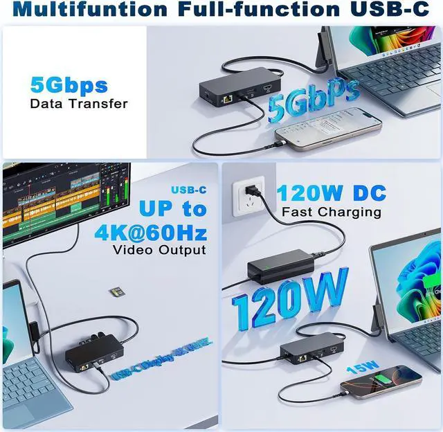 3-in-1 Full Function USB-C & 120W Surafce Power Supply AdapterSurface thunderbolt 4 dock design a full-function Type-C interface, support USB C 3.0, with a maximum rate of 5Gbps;USB C video expansion up to 6K@60HZ, and support 5V3A USB C fast charging. The microsoft surface pro docking station features a DC 15V4A-8A power input,supporting up to 120W fast charging, ensuring your Surface stays powered all day(This Surface Dock hub include a surface 120W DC power adapter charger).