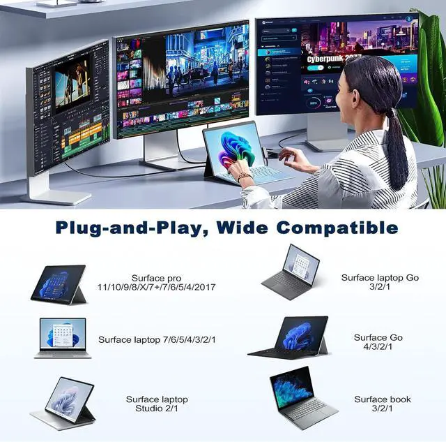 Broad Microsoft Surface Laptop Compatibility This Microsoft Surface Docking station with surface connection technology, is widely compatible with Microsoft Surface pro 12/11/10/9/8/X/7+/7/6/5/4/3,Microsoft Surface Laptop 7/6/5/4/3/2/1, Surface book 4/3/2/1, Surface go 4/3/2/1,Surface laptop go 3/2/1, Surface laptop studio 1/2, Surface laptop, Windows 11 AI+PC, Surface pro, Windows 11 AI+PC (Please connect to your surface power supply port when using)