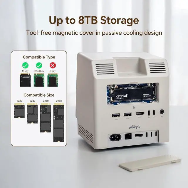 M.2 NVMe SSD Enclosure (Up to 8TB)Built-in M.2 SSD NVMe enclosure supports 22302280 drives, offering massive expandable storage with ultra-fast speed while doubling as an effective heatsink.
