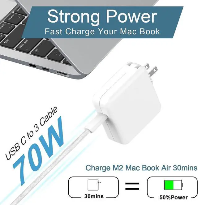 Super Fast Charging: thanks to a 70W / 20.6V/3.4A max output and USB Power Delivery 3.1, Using this power adapter to charge Mac Book Air models equipped with M2 chips can fully leverage the advantages of fast charging, taking only about 30 minutes to charge from 0% to up to 50% battery capacity