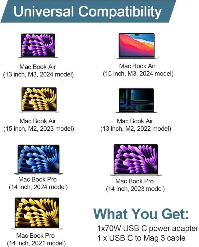 Wide Compatibility:The 70W USB C power adapter supports PD 70W output and compatible with Mac Book Air/Pro. Mac Book Air (13 inch, M4, 2024)Mac Book Air (15 inch, M4, 2024), Mac Book Air (13 inch, M3)Mac Book Air (15 inch, M3)Mac Book Air (15 inch, M2, 2023)Mac Book Air (13 inch, M2)Mac Book Pro (14 inch, M4 Pro ,2024)Mac Book Pro (14 inch, M3 Pro )Mac Book Pro (14 inch, M2 Pro ,2023),Mac Book Pro (14 inch, M1 Pro ,2021),Mac Book Pro (16 inch, intel,2019) model a2442, a2485, a2458, a2452, a2681, a2779, a2780.