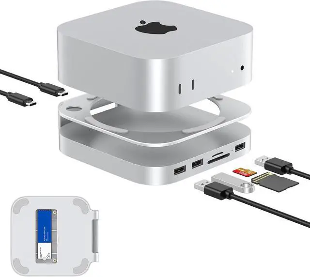Mac Mini Dock & Stand with Expansion Ports: This 9-in-1 Mac mini hub equipped with mount and Hub together with m.2 ssd enclosure fits NVMe/SATA M.2 SSD, Dual USB A(10Gbps), USB 2.0 and SD/Micro SD Card Readers. Extremely expand the function and extend memory for your Mac Mini M4. Turn Your Mac Mini M4 into a Workstation. Get the perfect angle, height, and orientation for any task or to suit any preference, making working from home/office easier than ever.