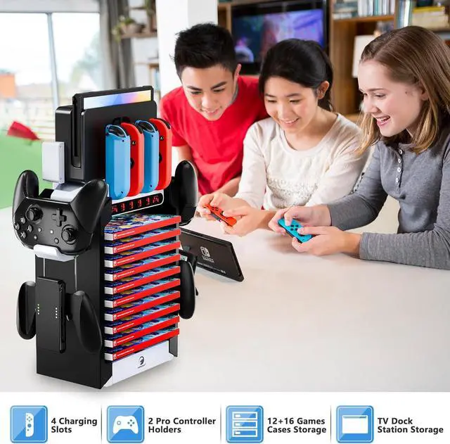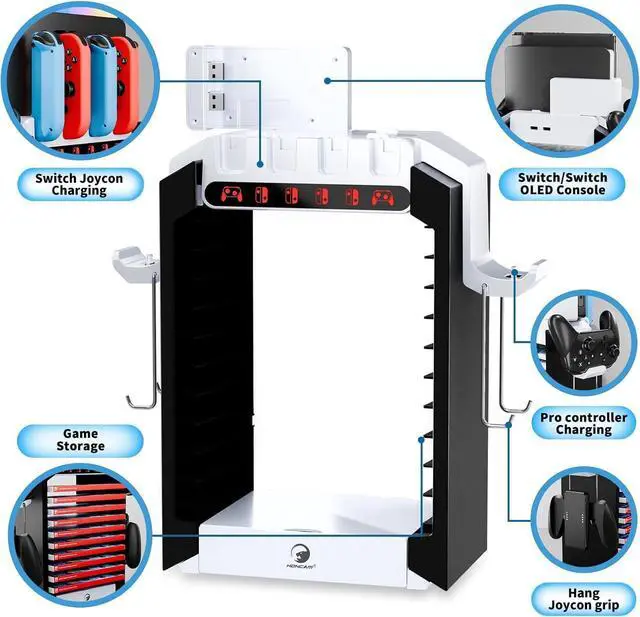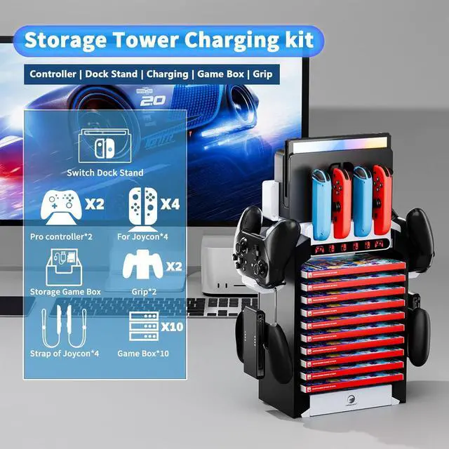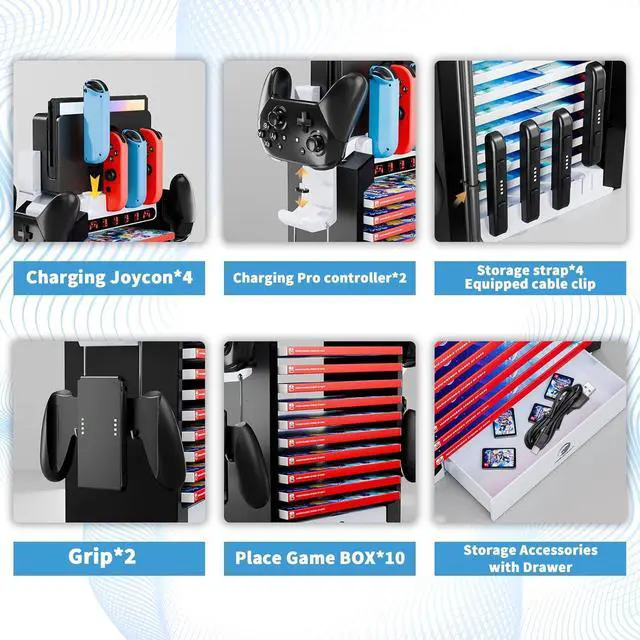 All-In-One Nintendo Switch OrganizerIn addition to charging 6 switch joycons controller simultaneously, HONCAM Switch storage tower is upgraded with powerful storage space, including 10 game card case, 2 Pro controllers, 2 JoyCon grip ,4 JoyCon strap storage and your favorite Switch OLED Dock. The drawer in the bottom offers you a good choice to collect your little stuff such as grips cover or game cards. Extra storage for tower make your game area clean and tidy,Save the space of your desk