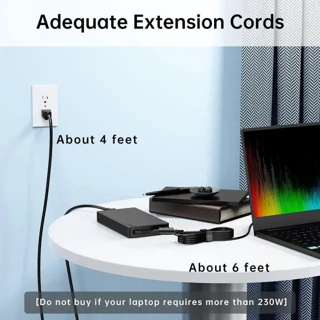The Dongerdi 230W charger is designed to deliver reliable, high-performance power for Acer gaming laptops, including Predator Helios, Triton, and Nitro series models. With an output of 230W (19.5V 11.8A), it provides fast and stable charging to keep your device performing at its best. The universal 100240V input supports use in different countries, making it an excellent choice for home, office, or travel. The 5.5x1.7mm round tip ensures compatibility with a wide range of Acer gaming laptops, including Predator Helios 300 PH315-54/53, Triton Neo 14/16 PHN14-51 PTN16-51, Triton 300/500, Nitro 16 AN16/17, and Nitro 5 AN515-58. Built-in safety features protect against short-circuit, over-current, over-voltage, and overheating, ensuring safe and reliable operation. A durable shell construction and a 10-foot total cable length (6-foot charger cord plus 4-foot power cord) provide extended reach and flexibility for convenient charging in any setup.