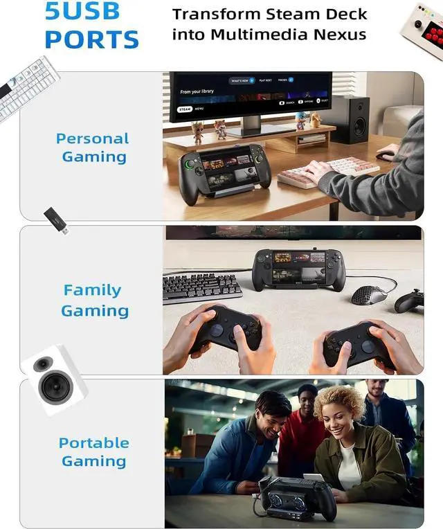 13-IN-1 Steam Deck DockLISEN Stream Deck Dock convert your Valve Steam Deck/ASUS ROG ALLY/Lenovo Legion Go USB Type c port into 10 PORTS and 3 EXTRA Function: HDMI 2.0(4K@60Hz), Gigabit Ethernet(1000Mbps),SD&TF Slot(U3), 2*USB3.0 ports(5Gbps), 3*USB2.0 ports, USB C PD charging(100W)and Dual Cooling Fan, Extended 40Gbps Adapter and 4pcs Grip Caps letting you explore a new way to play with Steam Deck. Note:For any usage questions, please contact LISENs professional customer service team