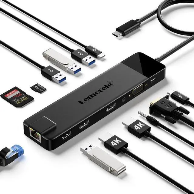 Lemorele USB C Docking Station for 3*Displays, 13-in-1 Hub Adapter to Dual HDMI, VGA, Gigabit Ethernet, 2 USB 3.0&2.0, 100W PD, USB-C Data, SD/TF, AUX 3.5mm for MacBook/HP/Dell/Lenovo