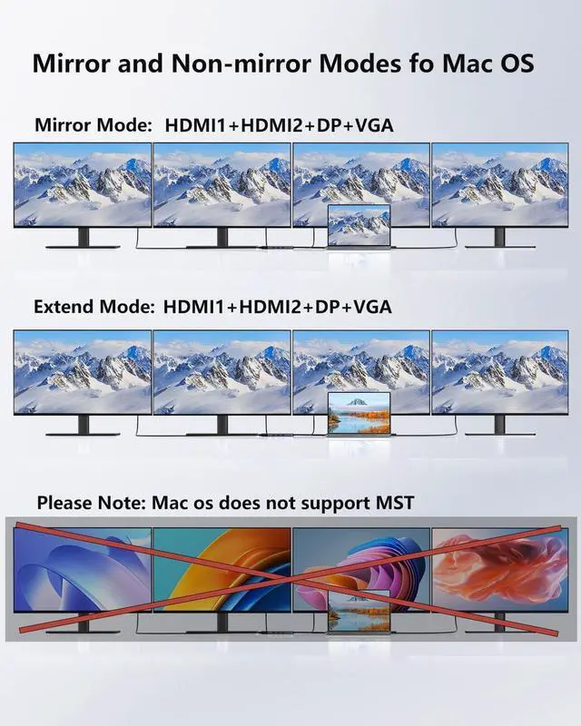 Equipped with two 4K HDMI ports (HDMI1 supports up to 4K@60Hz, HDMI2 supports up to 4K@30Hz), one 4K UHD DP port (up to 4K@60Hz), and one high-definition VGA port (up to 1920x1080@60Hz). These multiple interfaces enable you to easily connect to high-definition TVs, monitors, and projectors, enjoying a large-screen visual feast. You can mirror or extend two, three, four, or even five displays, seamlessly catering to both work and entertainment needs.
