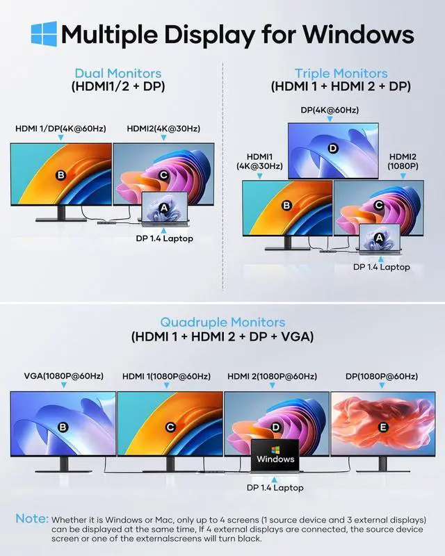 For laptops with DP1.2 interface: Connect via PC + HDMI1 + HDMI2 or PC + HDMI1/HDMI2 + DP. The maximum resolution of the two monitors can reach 4K@59Hz + 4K@29Hz.