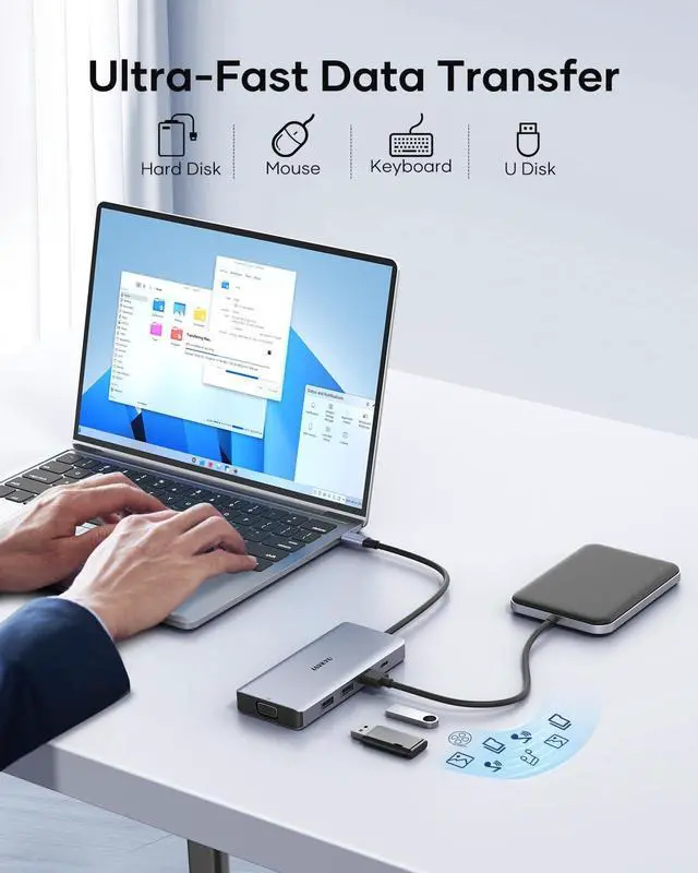The IAVKYU 8-in-1 USB-C docking station is not only incredibly powerful but also highly compatible. With a built-in Type-C port, it effortlessly adapts to various laptops on the market. Whether it's data transfer, video output, or device charging, it's a truly plug-and-play solution.