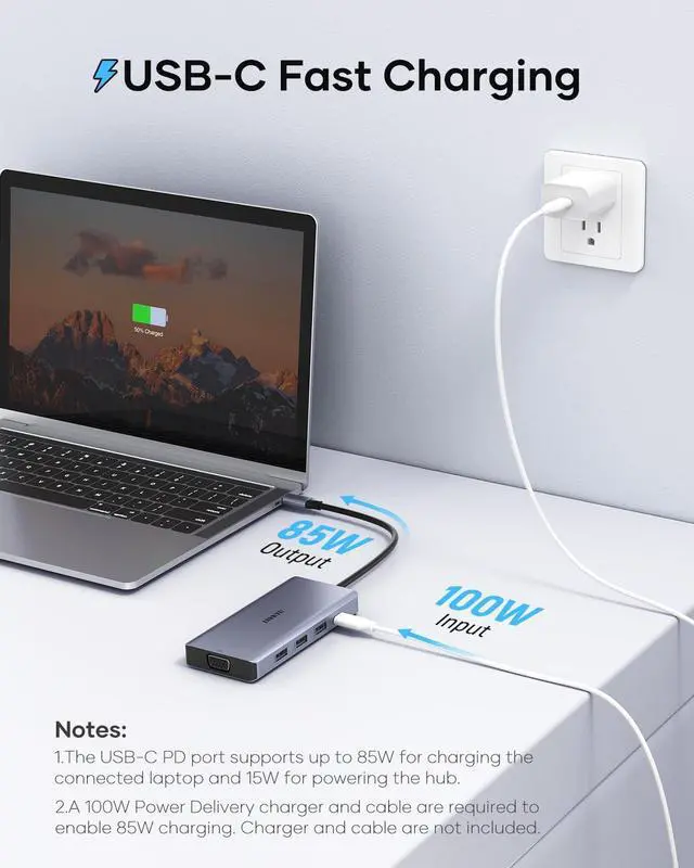 One PD3.0 port supports USB-C pass - through fast charging, with a maximum power of up to 100W, keeping your laptop charged at all times.