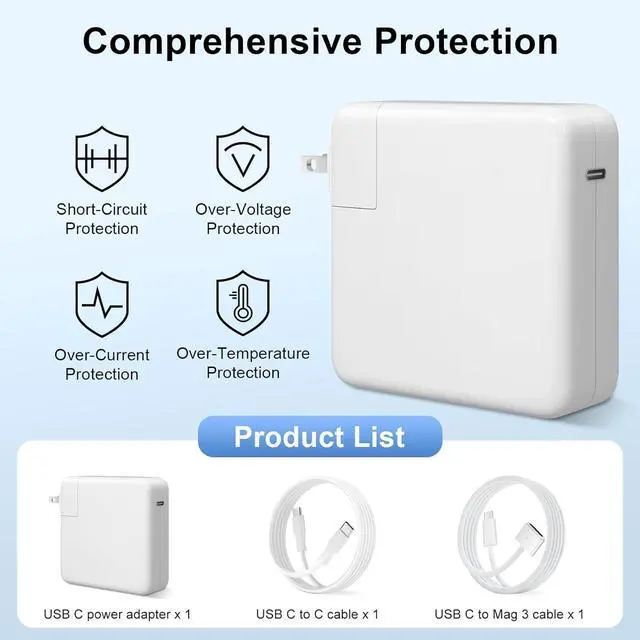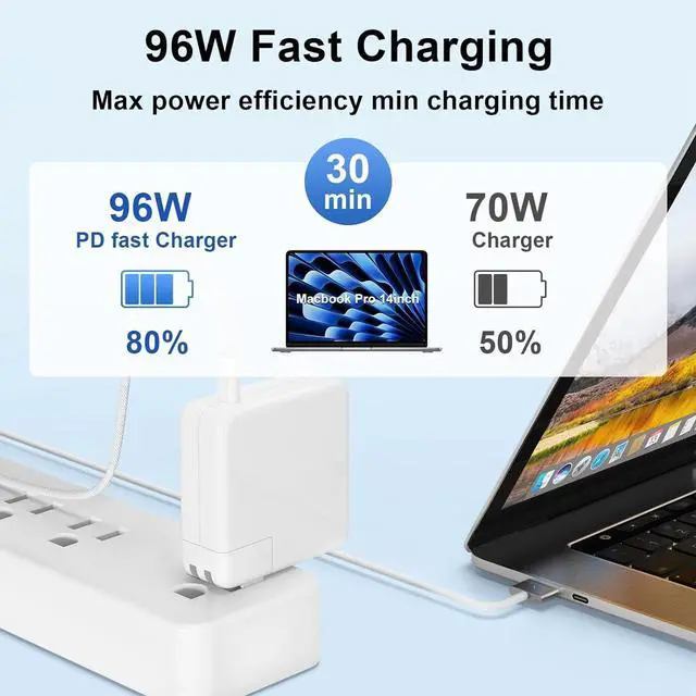 • [Super Fast Charging] Charge your Mac Book Pro 14-inch (M4, 2025) or Mac Book Air 13-inch (M4, 2025) to 50% in just 30 minutes. Our advanced charger delivers superior stability and efficiency over standard 35W and 70W models, effortlessly meeting the high-power demands of M-series Pro and Max chips.