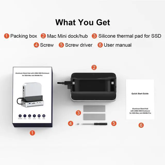 What You Get: It includes MC61 (model name), quick start guide for users, screws and screw driver for NVMe SSD installation, silicone thermal pads for NVMe SSD.