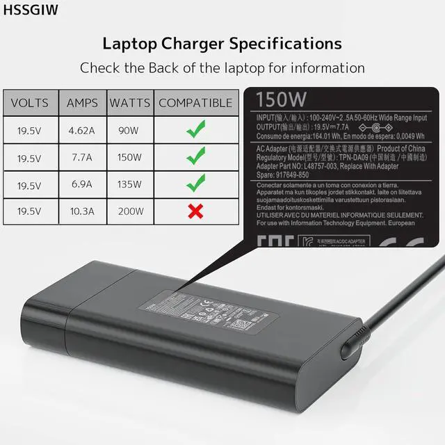 3. Compatible P/N: 150W 135W Power Adapter Fit for HP TPN-DA03 TPN-DA09 TPN-CA11 HSTNN-CA27 ADP-150XB B A150A05AL PA-1151-08HF W2F74AA W2F74UT#ABA Z5U90AV 3MD65AV Y1F28AV 917649-850 917677-003 917677-001 737737-001 737757-001 776620-001 75626-003 7645509-002 L32661-001 L15534-001 L48757-001 693709-001 693707-001 Replacement