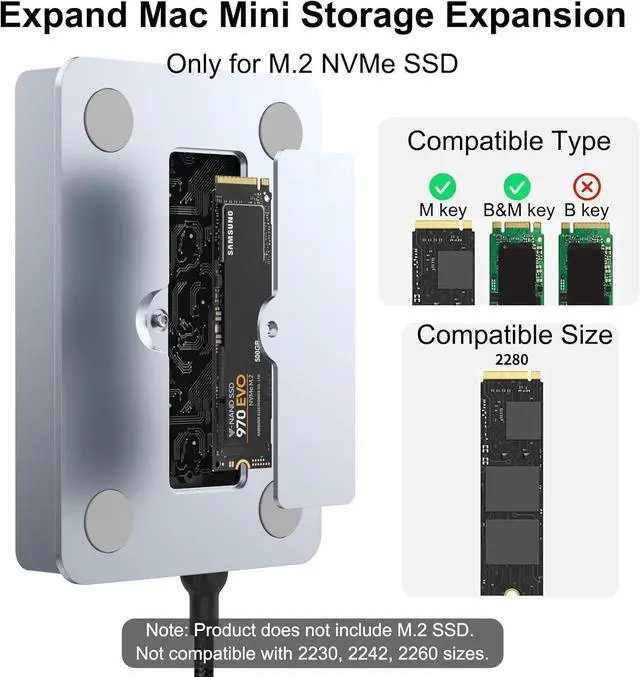 8TB Large Capacity, Easy to Expand StorageThe Mac Mini M4 dock is equipped with an SSD enclosure that supports up to 8TB M.2 NVMe SSD card (2280 size), easily handle large files, 4K editing, and data backup, and we've thought through every detail to make sure it's premium aesthetics and at the same time, all-around meets all the functions that help you be more efficient. (SSD not included)