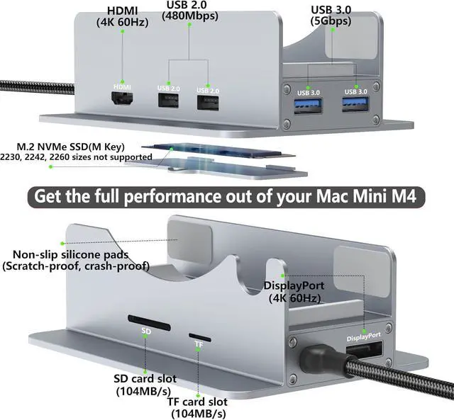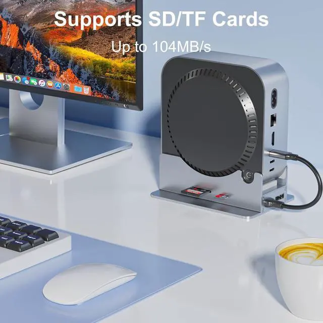 Detailed Design for Efficient UseThis Mac mini hub is the best accessories for Mac mini M4, you will experience extremely fast data transfer up to 5Gbps. Whether you're transferring large files, backing up data or streaming media, the front USB 2.0 port makes it easy and convenient to connect a mouse and keyboard, providing you with plenty of convenience. Dual card slots support SD/TF card read/write (104MB/s) Ideal for photographers, gamers and professional users to inspire your creativity and help you on your creative journey
