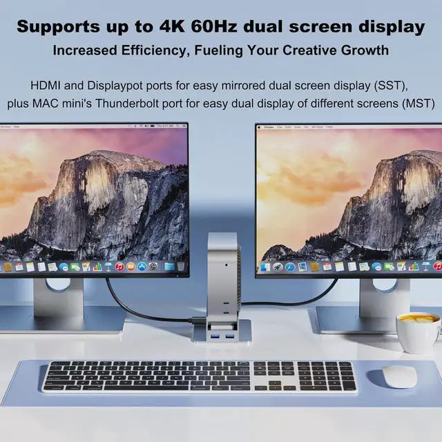 4K Ultra HD Dual Display This Mac Mini M4 docking station supports HDMI and DisplayPort dual port up to 4K60Hz output, which can easily mirror your screen to two additional monitors (MST mode not supported). Downward compatible with 2560*1440@60Hz/120Hz, 1920*1080@60Hz/120Hz, bringing you vivid visual feast and enhancing your work efficiency. Suitable for office meeting, data programming, data analysis, watching full HD movies, 3D video games, dedicated to solve all problems