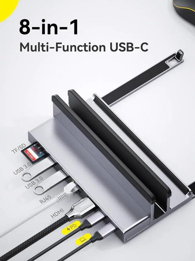 8-in-1 Macbook Docking Station StandSimply connect this docking station stands upstream port to your laptops Thunderbolt 3/4 port to instantly add a 4K@60Hz HDMI output, Gigabit Ethernet port, two USB-A 3.0 ports, a PD charging port, plus Micro SD and SD card slotsideal for thin and light laptops like Macs. These eight commonly used interfaces expand your connectivity options, resolve storage limitations, and reduce wear on your laptops ports caused by repeated plugging and unplugging.
