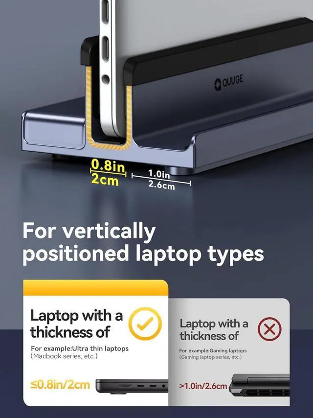 AllinOne USBC Dock, Tilt Stand & Vertical Laptop Holder The QUUGE Docking Station merges an ergonomic tilt stand, vertical storage for closed laptops (2 cm) and a USB C hub that turns one USBC port into multiple connectionsfreeing up to 40 % of desk space while reducing neck strain. Tips: Before use, please consult the product video for full setup and safety instructions, and ensure your laptops USBC port supports Thunderbolt 4 or fullfunction connectivity.
