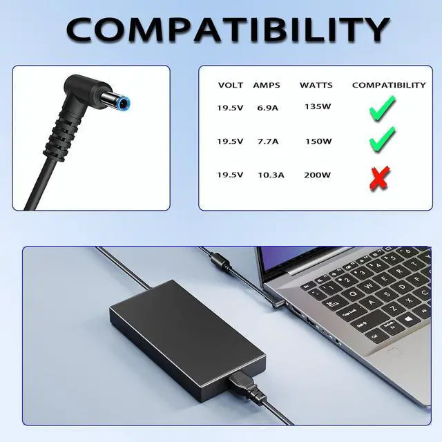 Connector size: 4.5mm x 3.0mmDC output : 19.5V ~ 7.7A 150W AC input voltage : 100 ~ 240V 50 ~ 60 Hz ;Compatible with 135W 6.9A