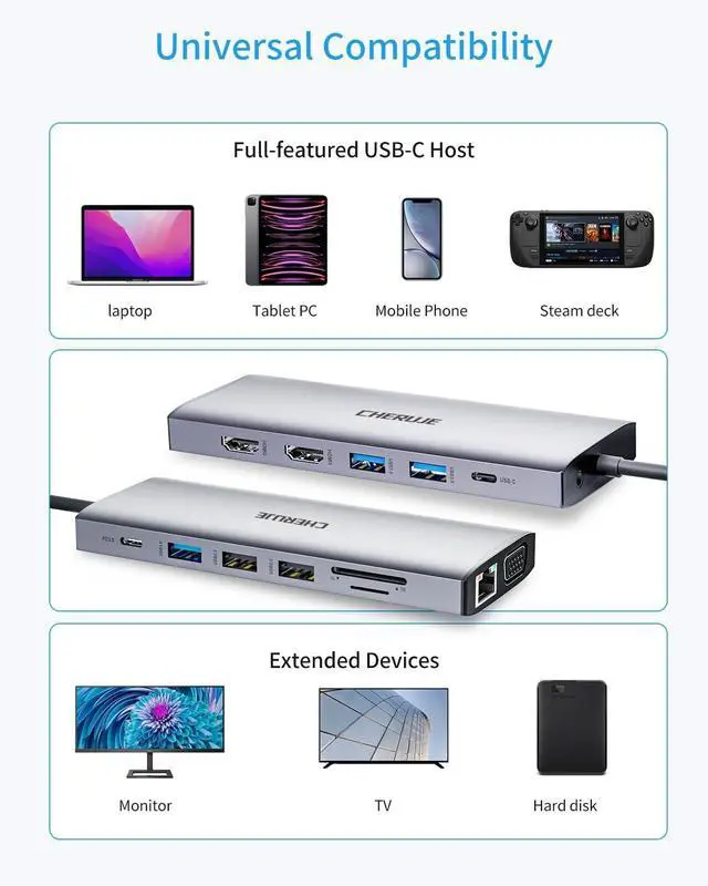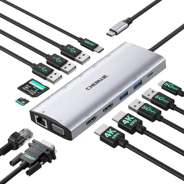 Dual/Triple Display Capability: This USB C docking solution doubles as a usb hub for laptop and triples as a USB C Hub Multiport Adapter with docking station 3 monitors functionality. Outfitted with two HDMI and one VGA ports, it offers up to 4K@30Hz in dual display mode and achieves 1080P@60Hz in triple display setting. It enables convenient video extension to larger external displays, enhancing visual comfort and significantly boosting office productivity.