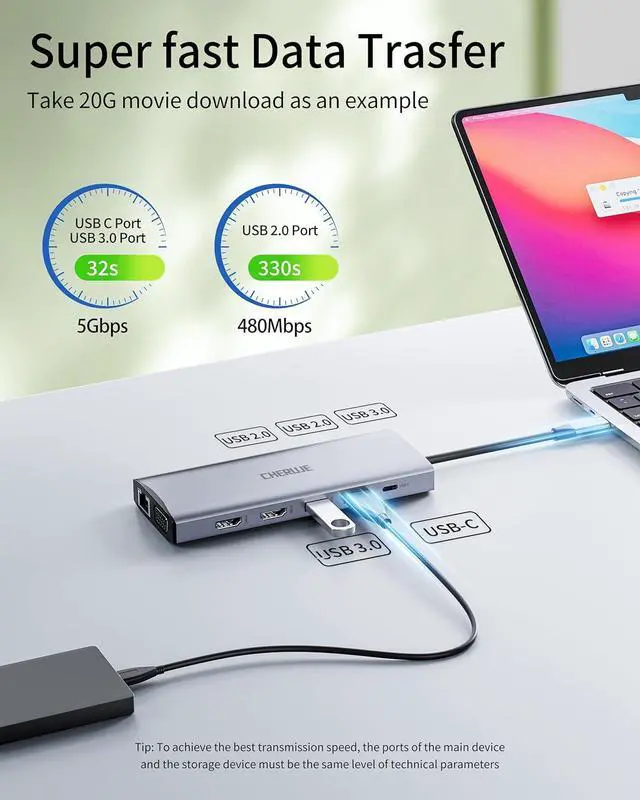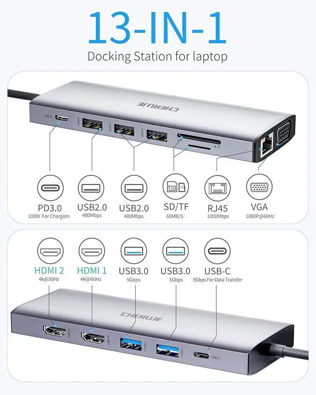 13-in-1 Laptop Docking Station: Increase the connectivity of your laptop with the IAVKYU laptop accessories - a usb c docking station. Featuring triple display with two 4K@30HZ HDMI and a 1080P@60HZ VGA, it ensures smooth workflow. With three USB3.0, two USB2.0 for speedy data transfer at 5Gbps and 480Mbps respectively, a charging port of 100W USB-C, and Ethernet for up to1000Mbps connection speed along with SD/TF slots.