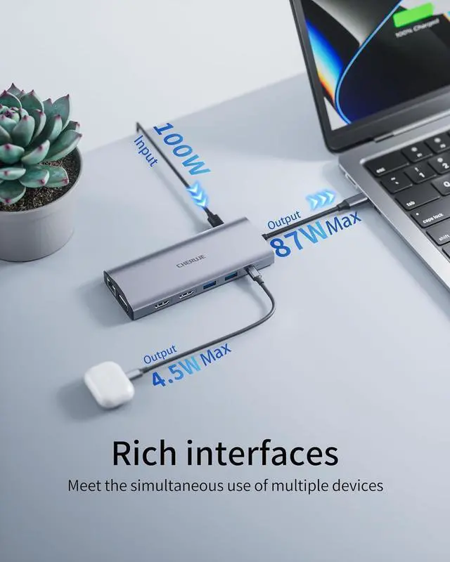 Speedy charging 100W: This laptop dock is ideal for connecting dual 4K monitor, enhancing both work and entertainment experiences. It features a USB-C power delivery port next to the SD/TF slot, ensuring your device is always charged with up to 100W input and 87W output. The usb c adapter includes dual HDMI ports; however, note that power chargers and cables are not included. Important: The second USB C port is dedicated to data transfer only.