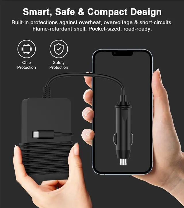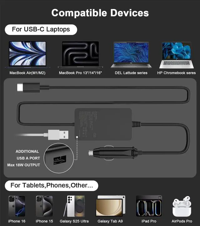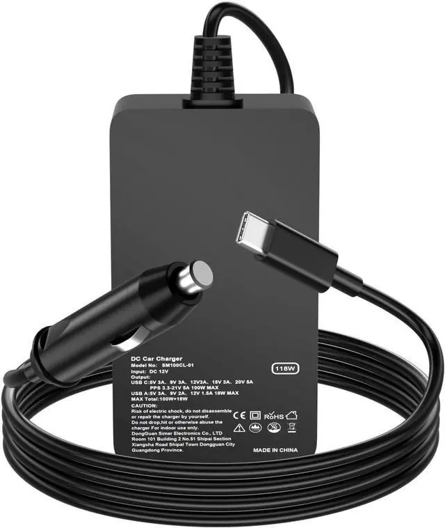 118W USB-C Car Charger Fast-charge your laptop and power other devices on the go. Works perfectly in cars, trucks, RVs, travel trailers, buses, vans, motorcycles, boats, and portable power stations. Features a 100W USB-C PD port (Compatable with 90W 65W 45W) and an 18W USB-A port for phones, earbuds, and more.