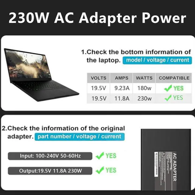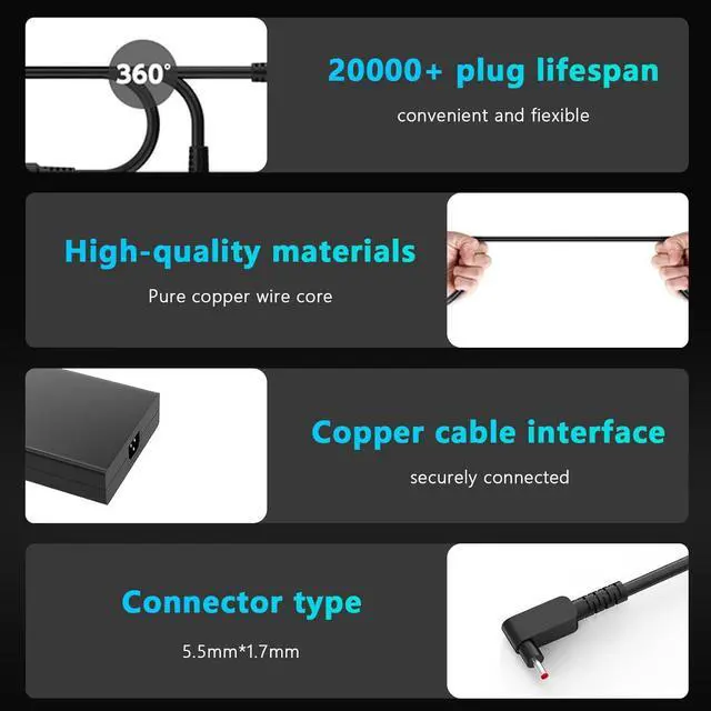 SafetyThe 230W laptop charger AC Adapter suitable Compatible with ACER has been made of high-quality materials, power cord has multiple protections: overcharge protection; Overvoltage protection; Overheating protection; Overcurrent protection; Short circuit protection; Lightning resistant laptop charger. You won't get stuck while playing games, giving you a smooth and beautiful gaming experience. This charger is suitable for various occasions, ensuring that your electronic devices always run efficiently